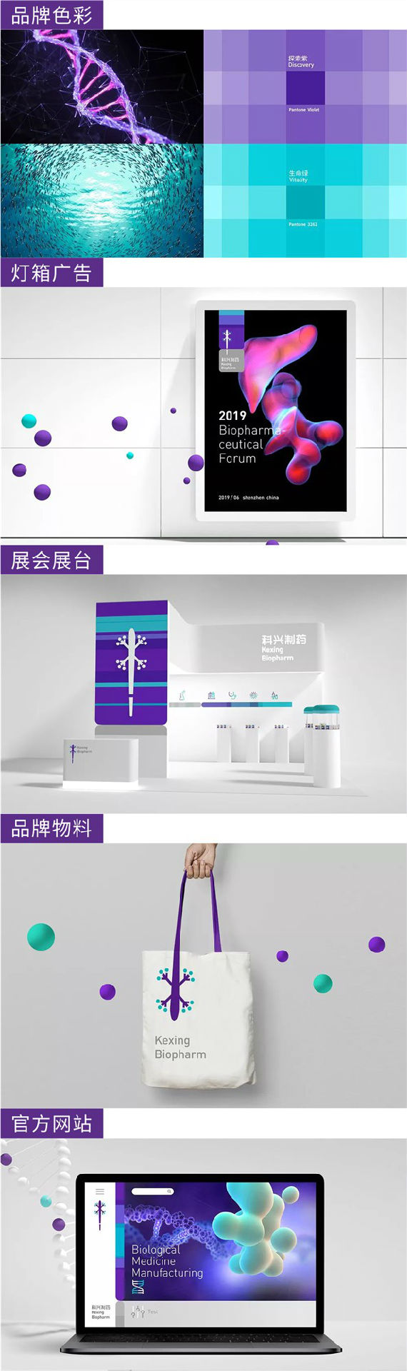 Kexing Biopharm ingeniously challenges the stereotyped image of pharmaceutical companies with an abstract, simplified logo design of a gecko with a fractured tail. The cell regeneration of the injured gecko resembles the process of rejuvenating the self-recovery of patients to fight disease, which explains biologicals' attribute in treatment — self-recovery. The logo depicts a gecko in purple with a regenerated tail and green toes. The combination of the two colors that symbolize exploration and life, respectively, is to convey a brand tonality of professionalism, keenness, truthfulness and entrepreneurship, making Kexing Biopharm outperform its peers in the pharmaceutical industry with a better-looking image.