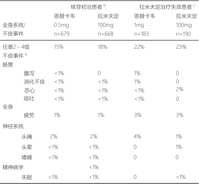 表2比較了在4項(xiàng)臨床研究中恩替卡韋和拉米夫定的不同。其中選擇了中到重度不良事件和治療過(guò)程中發(fā)生的至少有可能與治療相關(guān)的臨床不良事件作為比較的指標(biāo)。